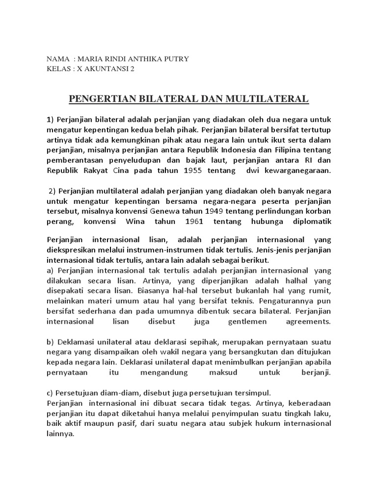 Perjanjian merupakan kesepakatan yang harus ditaati oleh pihak pihak terkait. Terjawab arti bilateral dan multilateral 2. Apa pendapat anda jika negara kita tidak ada mahkamah konstitusi 9. Jika dilihat dari sifat mengikatnya perjanjian internasional dapat dibedakan atas treaty contract dan law making treaty.