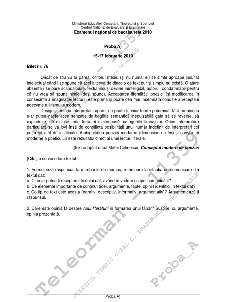 Bacalaureat Bilete Proba Orala 2010 Limba Romana Biletele 76 150