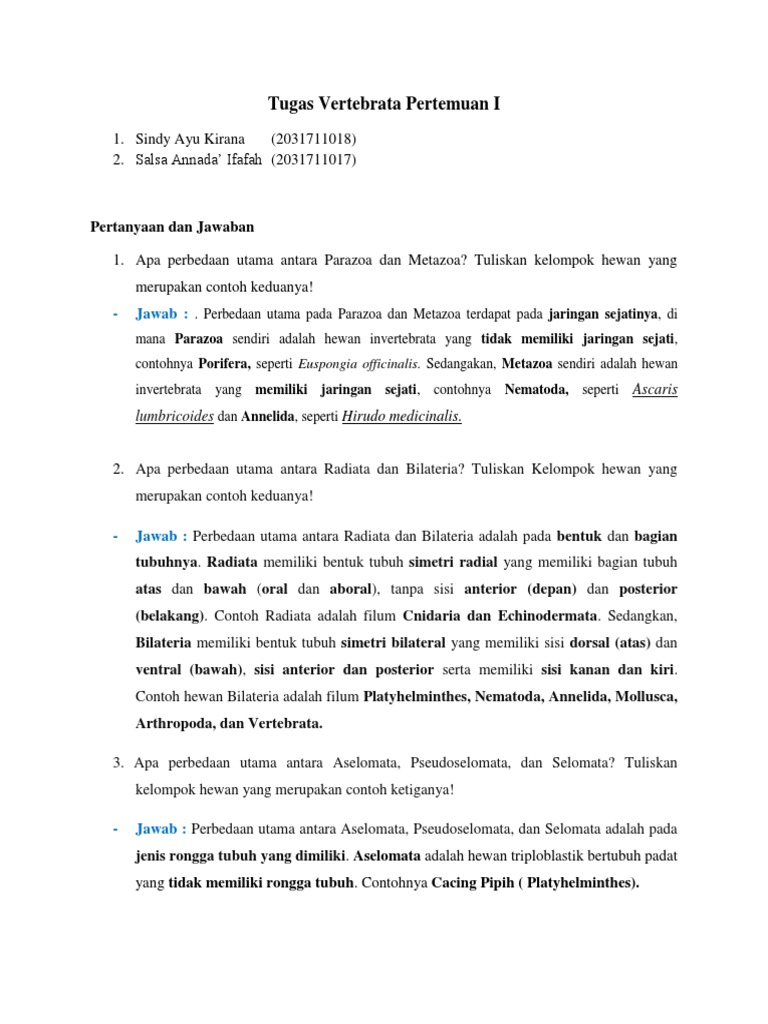 Tugas Vertebrata Pertemuan I Pertanyaan Dan Jawaban