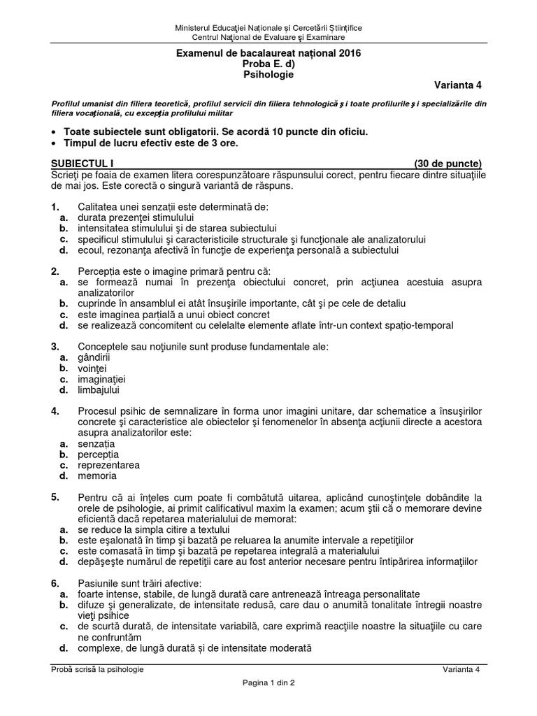 Bacalaureat 2016 Modele Subiecte Bac Psihologie 2016 Si Barem